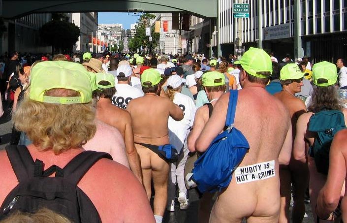 A small walking segment of the yellow hatted BARE-2-B'ers approach the base of the highly congested